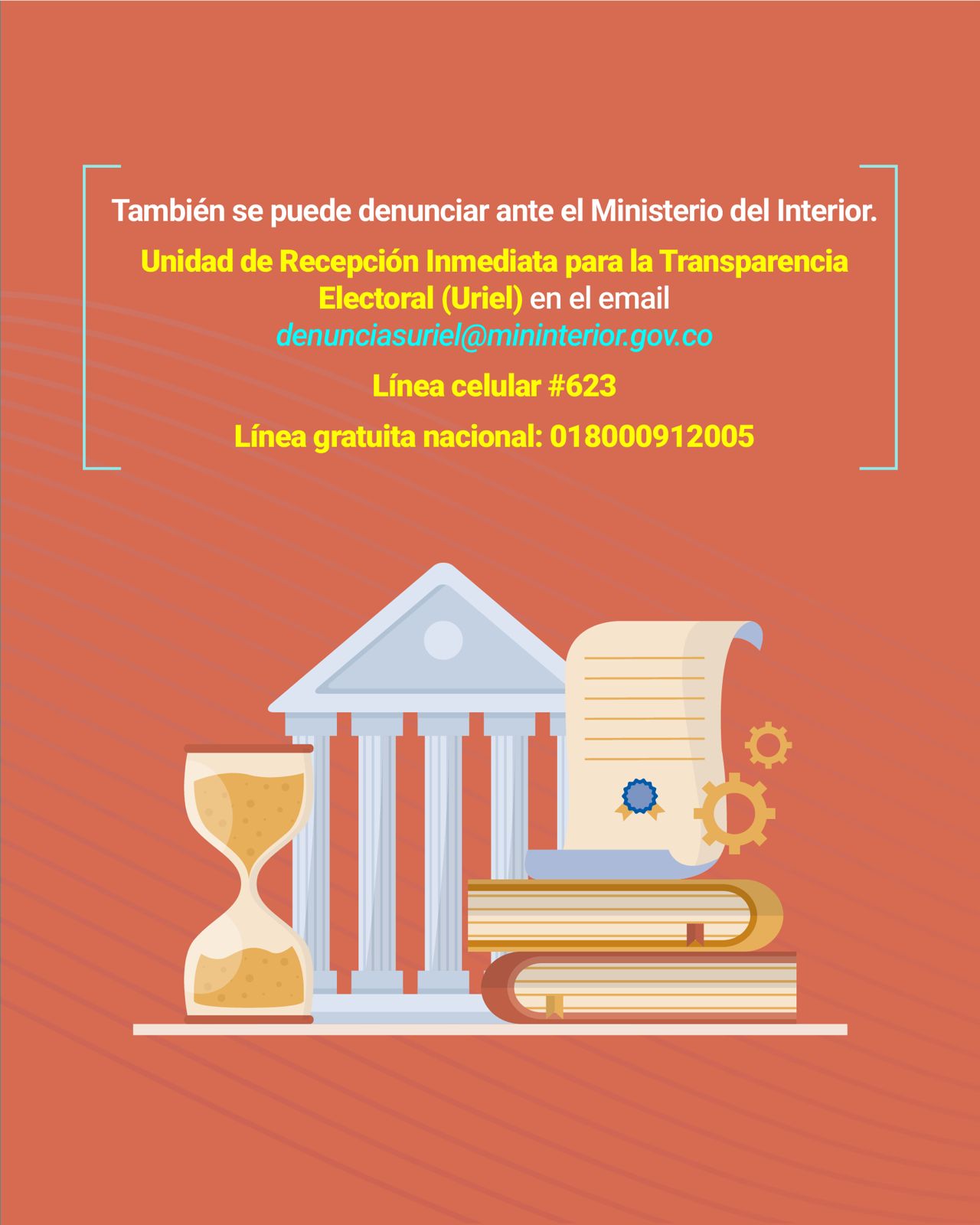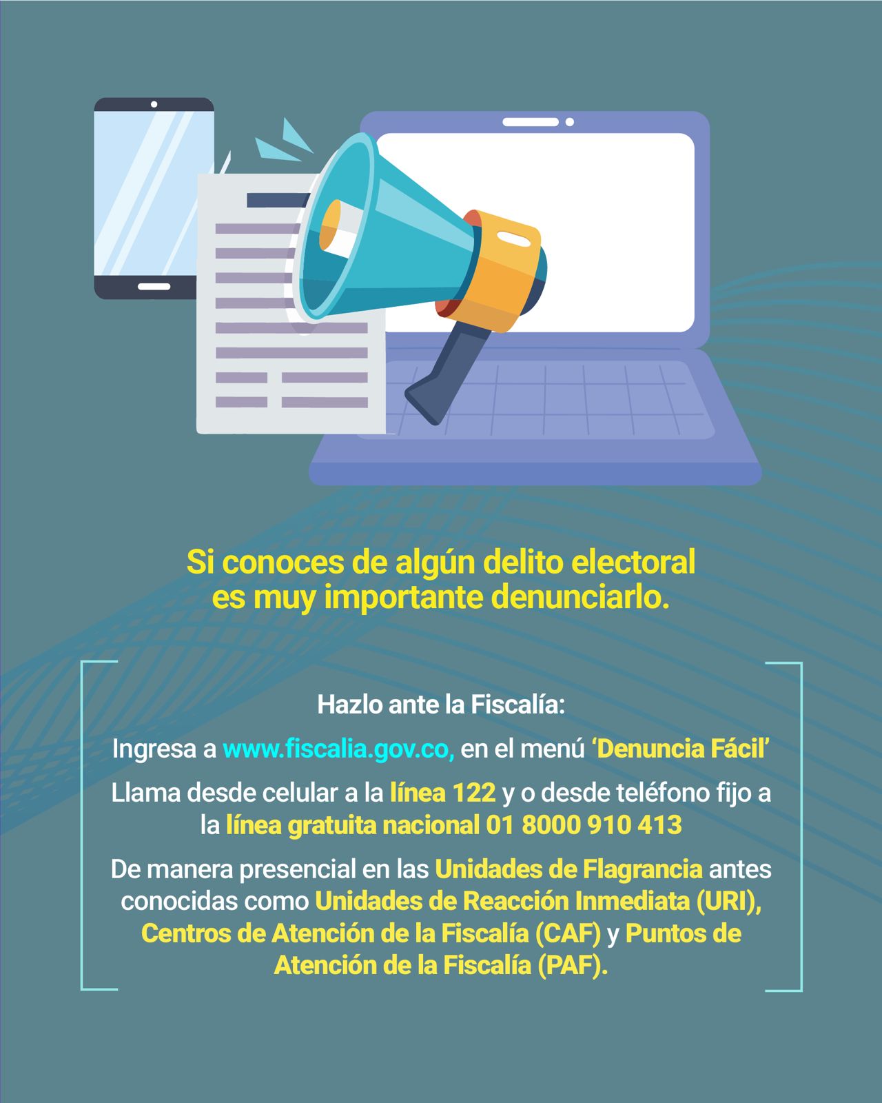 Centro de Contacto de la Fiscalía General de la Nación: Línea nacional gratuita (01 8000 9197 48) desde su celular marque gratis al 122. Denuncie hechos de corrupción a través de las líneas del Centro de Contacto. Línea de Atención Dirección de Protección y Asistencia: 018000912280 - (+57) 601 7910758 Horarios de atención: Unidades de Reacción Inmediata (URI): 24 horas, 7 días a la semana Otras dependencias: 8 a.m. - 6 p.m