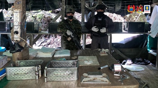 En el complejo ilegal también se incautaron cerca de dos toneladas de insumos sólidos (cal, soda caustica, permanganato de potasio, carbón activado, cemento y metalbisulfito), algo más de 7.000 galones de precursores líquidos (acetonas, ácido sulfúrico, cloroformo y ácido clorhídrico), moldes metálicos, marquillas plásticas adhesivas, rollos de cinta, grameras, extractores de aire, empacadoras al vacío y hornos microondas.