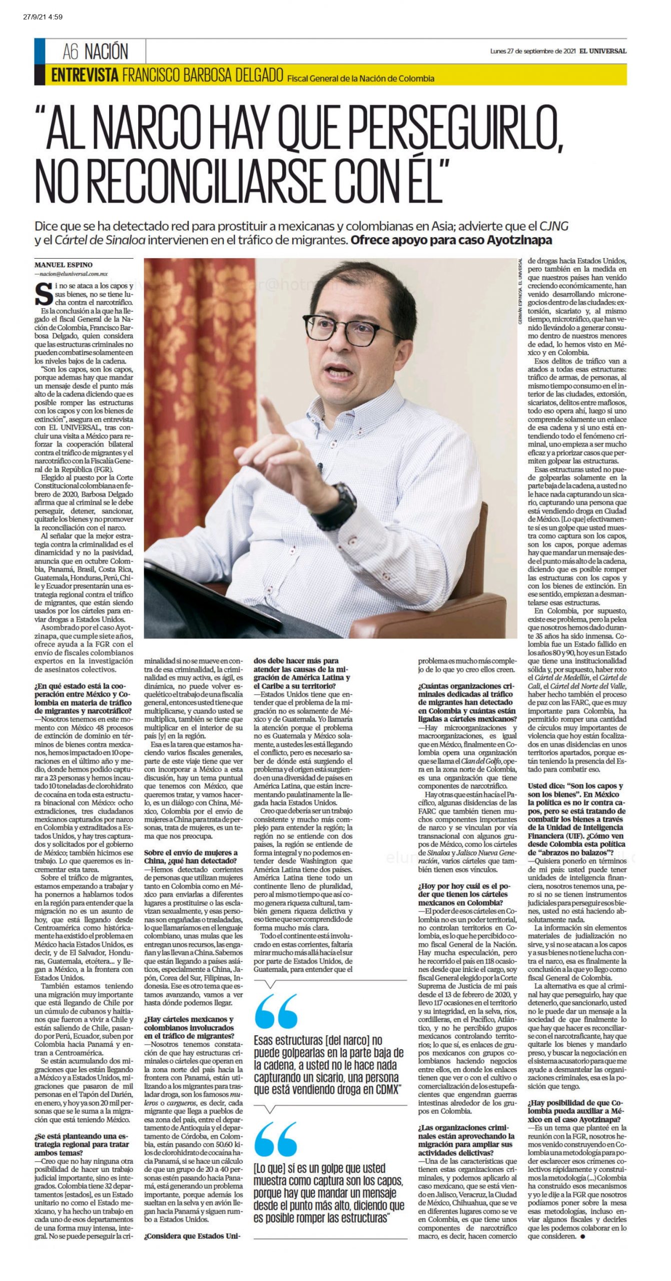 Elegido al puesto por la Corte Constitucional colombiana en febrero de 2020, Barbosa Delgado afirma que al criminal se le debe perseguir, detener, sancionar, quitarle los bienes y no promover la reconciliación con el narco.