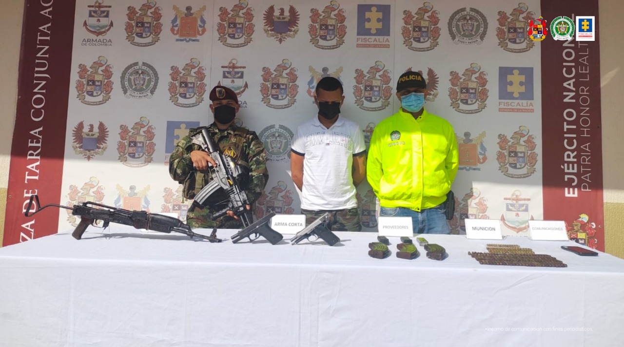 Este hombre fue capturado en una diligencia de registro y allanamiento realizada por la Fiscalía General de la Nación, en articulación con el Ejército Nacional y la Policía Nacional, en el corregimiento Cuturu de Caucasia (Antioquia). En el procedimiento fue incautado un fusil AK-47, dos pistolas, seis proveedores, 159 cartuchos y un celular.