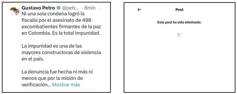 - El mensaje y las cifras mentirosas que trino el Presidente de la República, Gustavo Petro no corresponden a los datos del informe trimestral que presenta la Misión de la Organización de Naciones Unidas (ONU) en Colombia. El presidente Petro al advertir la falsedad, borró su mensaje.
