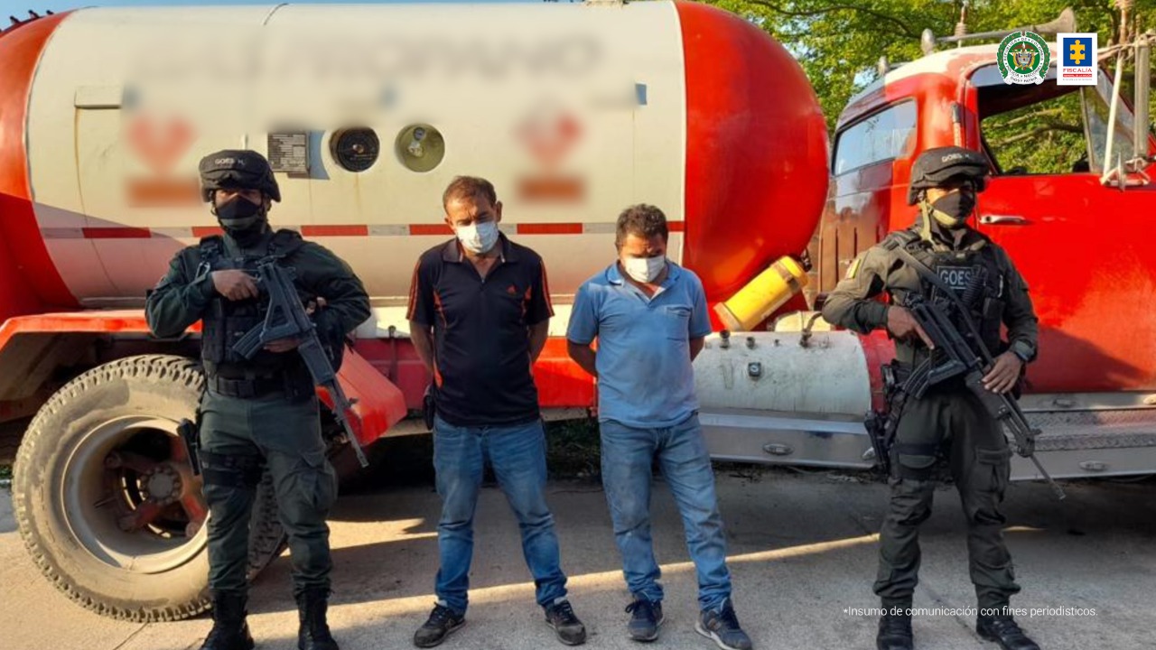 Los detenidos, identificados como Leovigildo Miranda Garzón y Jaime Octavio Rojas González, habrían instalado una válvula ilícita y estaban desviando gas licuado del petróleo (GLP) a un camión cisterna con capacidad para almacenar hasta 1.700 galones.