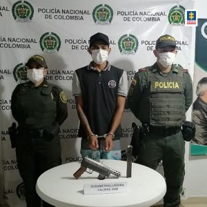 Un hombre identificado como Esteban David Mina Casamachín, de 20 años de edad, fue privado de la libertad por su presunta responsabilidad en el porte de una subametralladora artesanal, un proveedor y munición; sin contar con el permiso requerido.