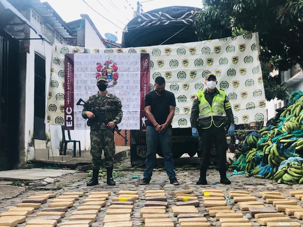 En la inspección se constató que en el automotor iban 26 bultos de racimos de plátanos cuyo destino era Florencia (Caquetá) entre los alimentos iban los paquetes de la sustancia estupefaciente.